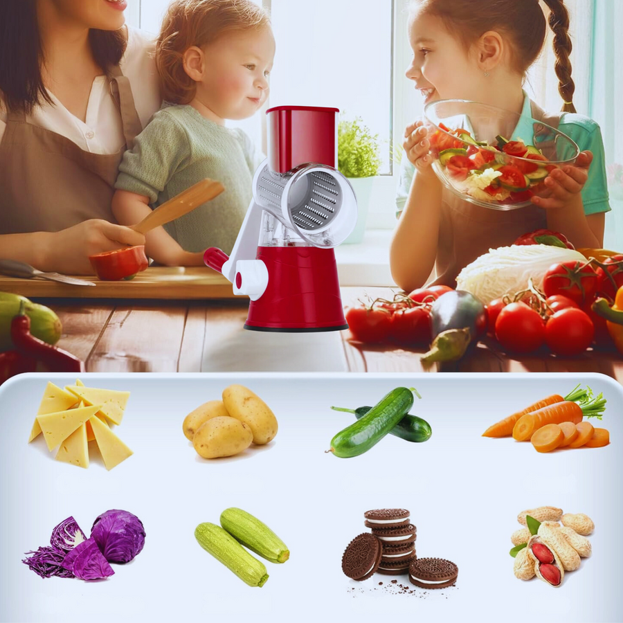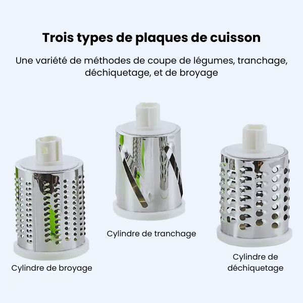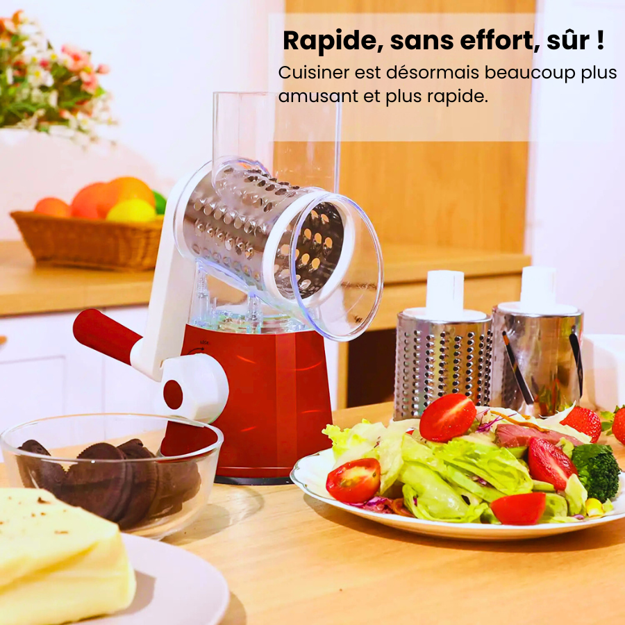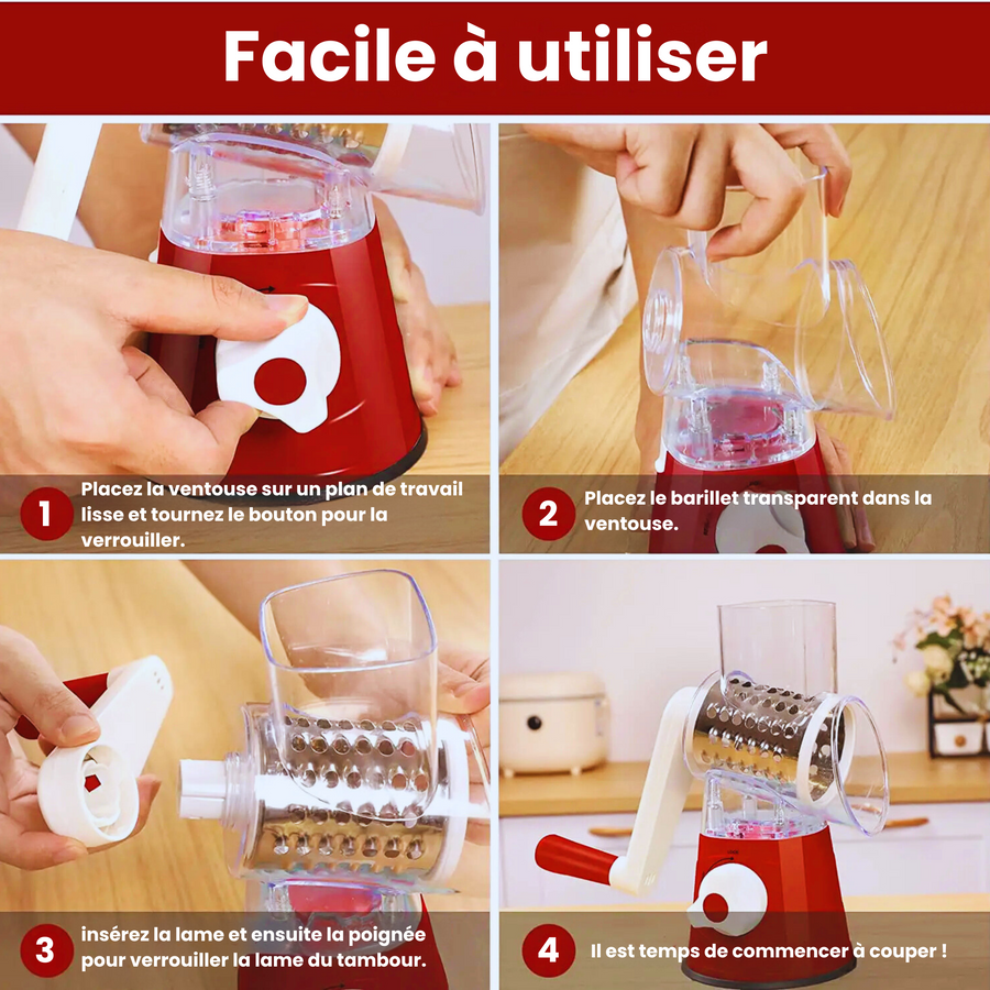 Vous avez assez de passer des heures à préparer vos ingrédients à la main? Cet outil révolutionnaire vous permet de râper et de trancher vos aliments en un instant, que ce soit du fromage, des légumes ou même des fruits. Il vous suffit de placer vos ingrédients dans l'appareil, de tourner la manivelle, et voilà ! Vous obtenez des résultats parfaits sans effort, rendant ainsi la préparation de vos plats aussi agréable que rapide.